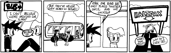 Most importantly, I can't honestly say all of this is good. Such is the catch 22 of webcomics — the pool may be a hundred kilometres wide, but it's only a few millimetres deep. It was a wonderful learning experience, especially in the early-ish days before webcomics really took hold, and I hope you had as much fun back then as I did. After all, it's a good thing it was fun then, because these strips sure are embarassing to look back on now.