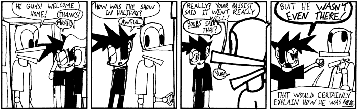 Most importantly, I can't honestly say all of this is good. Such is the catch 22 of webcomics — the pool may be a hundred kilometres wide, but it's only a few millimetres deep. It was a wonderful learning experience, especially in the early-ish days before webcomics really took hold, and I hope you had as much fun back then as I did. After all, it's a good thing it was fun then, because these strips sure are embarassing to look back on now.