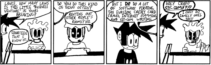 Inside Joke was my poorly-named and poorly-executed first attempt at a comic strip, which I started publishing on the internet long before it was ready. I jumped from Tripod to Geocities, and was never never happy with either free host. Then Keenspace came along, and Inside Joke moved there.