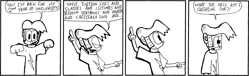 Most importantly, I can't honestly say all of this is good. Such is the catch 22 of webcomics — the pool may be a hundred kilometres wide, but it's only a few millimetres deep. It was a wonderful learning experience, especially in the early-ish days before webcomics really took hold, and I hope you had as much fun back then as I did. After all, it's a good thing it was fun then, because these strips sure are embarassing to look back on now.