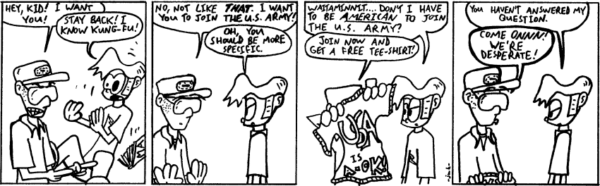 Most importantly, I can't honestly say all of this is good. Such is the catch 22 of webcomics — the pool may be a hundred kilometres wide, but it's only a few millimetres deep. It was a wonderful learning experience, especially in the early-ish days before webcomics really took hold, and I hope you had as much fun back then as I did. After all, it's a good thing it was fun then, because these strips sure are embarassing to look back on now.