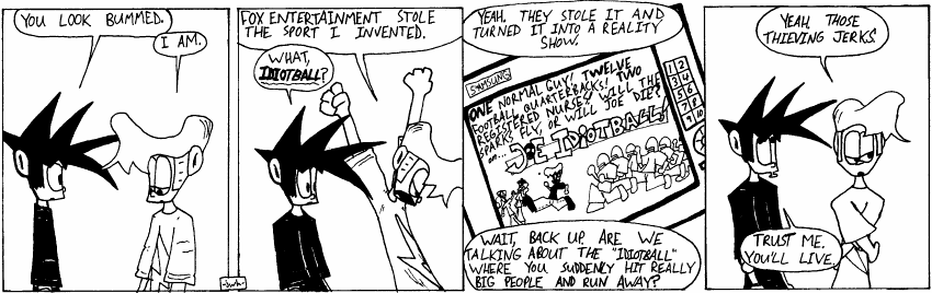 Inside Joke was my poorly-named and poorly-executed first attempt at a comic strip, which I started publishing on the internet long before it was ready. I jumped from Tripod to Geocities, and was never never happy with either free host. Then Keenspace came along, and Inside Joke moved there.