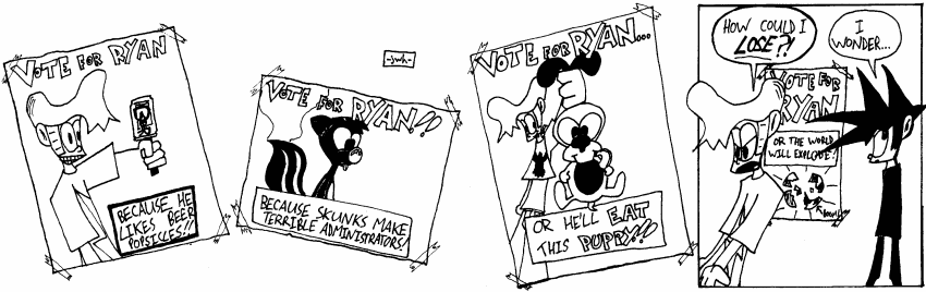 Most importantly, I can't honestly say all of this is good. Such is the catch 22 of webcomics — the pool may be a hundred kilometres wide, but it's only a few millimetres deep. It was a wonderful learning experience, especially in the early-ish days before webcomics really took hold, and I hope you had as much fun back then as I did. After all, it's a good thing it was fun then, because these strips sure are embarassing to look back on now.