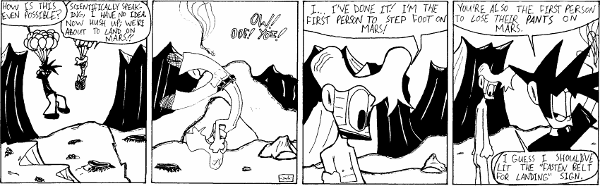 Most importantly, I can't honestly say all of this is good. Such is the catch 22 of webcomics — the pool may be a hundred kilometres wide, but it's only a few millimetres deep. It was a wonderful learning experience, especially in the early-ish days before webcomics really took hold, and I hope you had as much fun back then as I did. After all, it's a good thing it was fun then, because these strips sure are embarassing to look back on now.