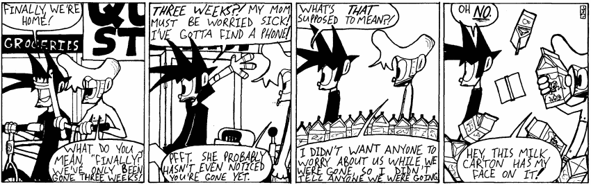 Most importantly, I can't honestly say all of this is good. Such is the catch 22 of webcomics — the pool may be a hundred kilometres wide, but it's only a few millimetres deep. It was a wonderful learning experience, especially in the early-ish days before webcomics really took hold, and I hope you had as much fun back then as I did. After all, it's a good thing it was fun then, because these strips sure are embarassing to look back on now.