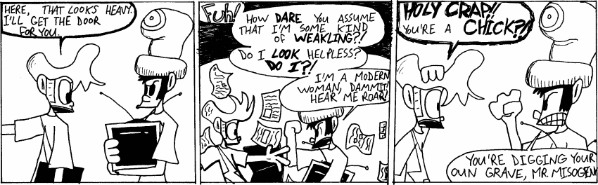 Most importantly, I can't honestly say all of this is good. Such is the catch 22 of webcomics — the pool may be a hundred kilometres wide, but it's only a few millimetres deep. It was a wonderful learning experience, especially in the early-ish days before webcomics really took hold, and I hope you had as much fun back then as I did. After all, it's a good thing it was fun then, because these strips sure are embarassing to look back on now.